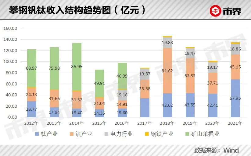 截至当前,攀钢钒钛主要收入分别由钛、钒和电三大产业贡献,2021年三部分业务收入占比分别为48.33%、32.11%和13.41%,合计占总收入的9成以上。