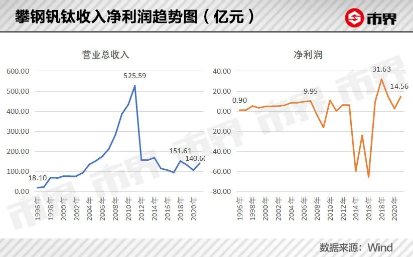 直到2017年,攀钢钒钛才逐渐开始将收入稳定在100亿元至150亿元之间,净利润也保持正数,但波动还是很明显,2018年至2021年净利润分别为31.63亿元、14.56亿元、2.43亿元和14.56亿元。