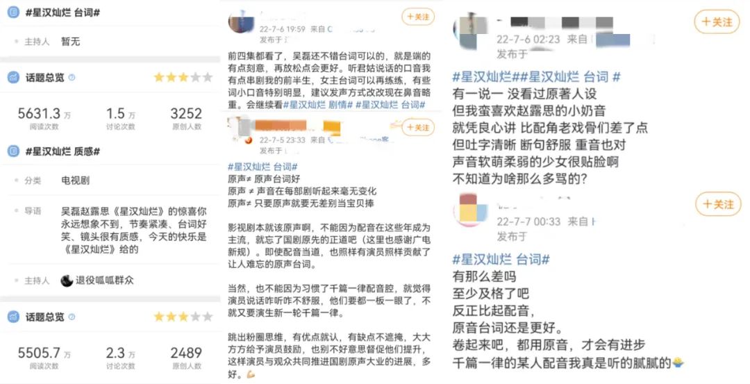 伴随而来的并不只是叫好,比如有声音认为《星汉灿烂》演员气短发音有问题;也有的先指出对方说的戏份,与人物装病的表现其实非常符合,又接上一句“演员原声台词,诚意十足”。跟着的留言也会毫不意外地出现“演员用原声不是基本要求吗?”