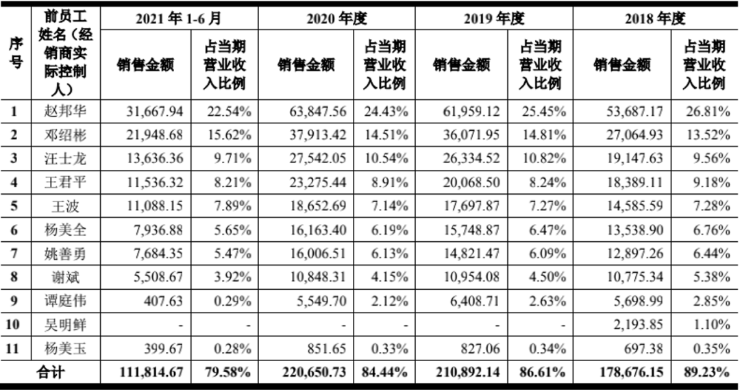 招股书显示,在紫燕食品的130多名经销商中,有12名是公司的前员工,报告期内,公司对这些“前员工”经销商的销售收入在总营收中的占比分别为 89.23%、86.61%、84.44%和79.58%,而这12名前员工离职前的身份大多数为区域管理人员、公司元老、实控人的近亲属,甚至有些曾经还是公司名义上的股东。