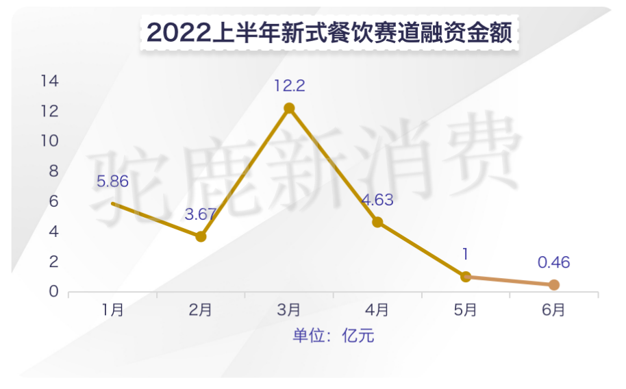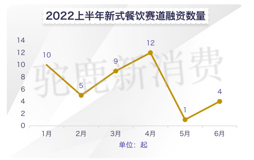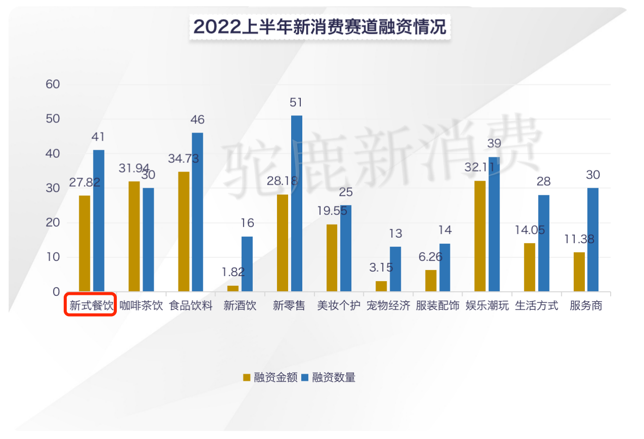 驼鹿新消费通过统计发现,2022年上半年,新式餐饮赛道虽受疫情影响较大,但是总体融资数量上并不低,达到41起,仅次于食品饮料和新零售两个赛道,从融资金额上看,处于新消费行业中游水平,说明新式餐饮赛道依然被看好,只是资本更加谨慎了。