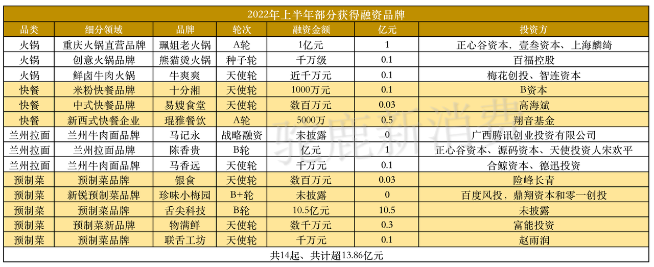 驼鹿新消费根据上半年获得融资的新式餐饮品类归纳分类,可以看出,2022年上半年,获得融资的品牌主要以预制菜、兰州拉面、快餐、火锅这四个品类为主。不同于去年的多品类发展,今年上半年的融资情况更偏向于传统餐饮为主,除了预制菜这个新概念火热外,兰州拉面、快餐、火锅等都是传统的餐饮品类。2022年上半年,该4种品类共获得了14起,合计13.86亿元的融资,占新式餐饮赛道总金额的50%。