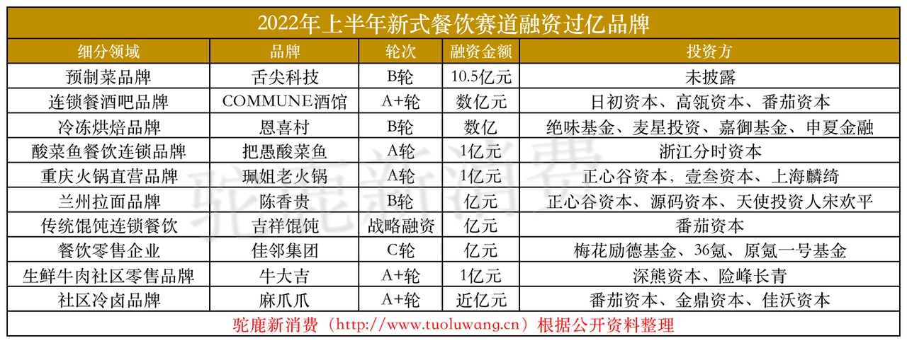 2022年上半年,新式餐饮赛道共有10家品牌获得过亿融资。除了舌尖科技高达10.5亿元的融资外,还有不少知名连锁品牌获得过亿融资,COMMUNE酒馆新型的“酒馆+餐饮”模式也是近年来十分受欢迎的商业模式,获得了日初资本、高瓴资本、番茄资本等知名资本投资,冷冻烘焙品牌恩喜村也获得了数亿元B轮融资。其他获得过亿融资的品牌还有把愚酸菜鱼、珮姐老火锅、陈香贵、吉祥馄饨等等。