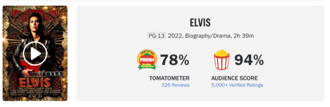 从口碑来看,《猫王》的烂番茄新鲜度达到78%,为导演自30年前处女作《舞国英雄》后评价最高的作品,在CinemaScore上也收获A-的评分。而音乐剧情片本身澎湃的娱乐性,更让影片在戛纳赢得12分钟的起立鼓掌。值得一提的是,《猫王》的片长达到159分钟,包含多首普雷斯利的经典名曲,其中既有“猫王”的原声片段,也不乏男主角的重新演绎。
