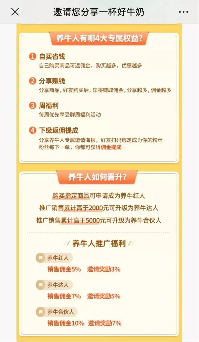 其中,最主要的就是购买会员卡的联名认养模式。为了吸引更多用户办卡,2018年认养一头牛提出“分享家”概念,成为“分享家”的用户通过拉新办卡,最高可获得15%的提成。此后,这种分销模式进一步升级为“养牛合伙人”,用户只要购买297-1188元的商品,就可以申请成为初级的“养牛红人”;用户推广销售累计高于2000元可升级为“养牛达人”,推广销售累计高于5000元可升级为“养牛合伙人”。级别越高,获取的销售佣金越高,一般在5%-10%之间。如果用户能够邀请好友加入,还能获得3%-7%的拉新奖励。