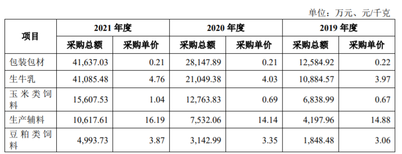认养一头牛将毛利率下滑归因于原材料价格上涨和产品价格调整。其中,外购原奶是认养一头牛最大的原材料花费。2019年至2021年,认养一头牛生牛乳采购量从2.74万吨增加至8.63万吨,由于采购单价从3.97元/千克增加至4.76元/千克,相应的采购费用从1.09亿元增加至4.11亿元。