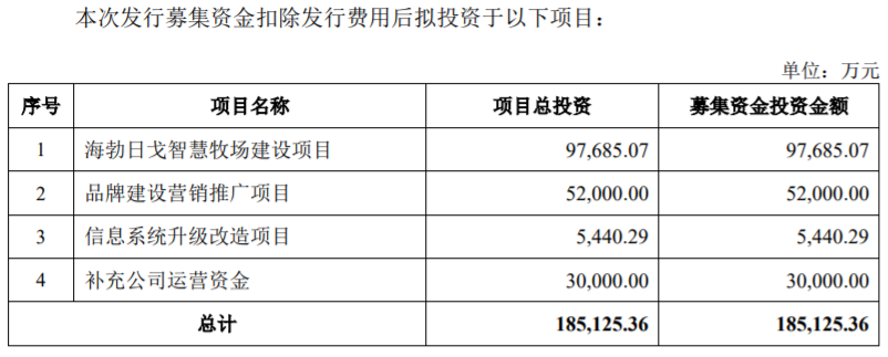 本次冲击IPO,认养一头牛计划募资18.5亿元,其中9.77亿元投向海勃日戈镇的智慧牧场项目,5.2亿元用于品牌营销推广,3亿元用于补充运营资金,其余5400多万元用于信息系统升级改造。