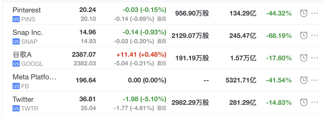 相比之下,推特受到马斯克私有化交易的提振,今年以来股价仅下跌了 14.8%,在同类企业中跌幅最小。