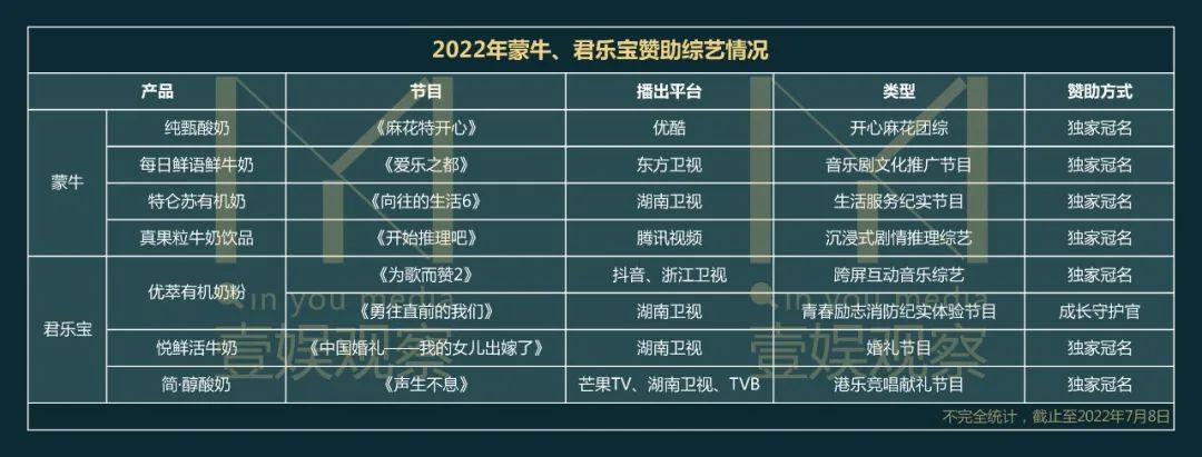 相较而言,乳制品的两位大户——伊利和蒙牛,比手机们对综艺痴情得多,其中的伊利也成为了2022年综艺市场的最大金主,仅一个上半年,就赞助了超过15档综艺,且多数是独家冠名。