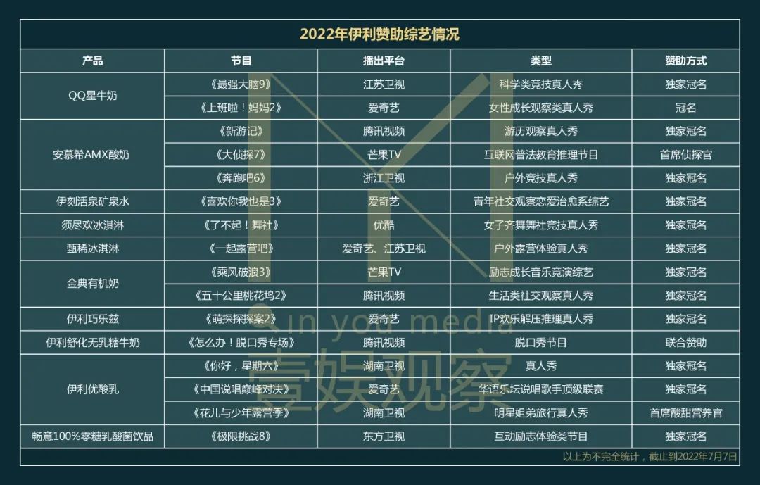 “像伊利这样的大品牌,做惯了独家冠名,一般对小节目和小身份是不会感兴趣的。”这句话同样被壹娱观察整理的2022年伊利综艺赞助情况所印证。