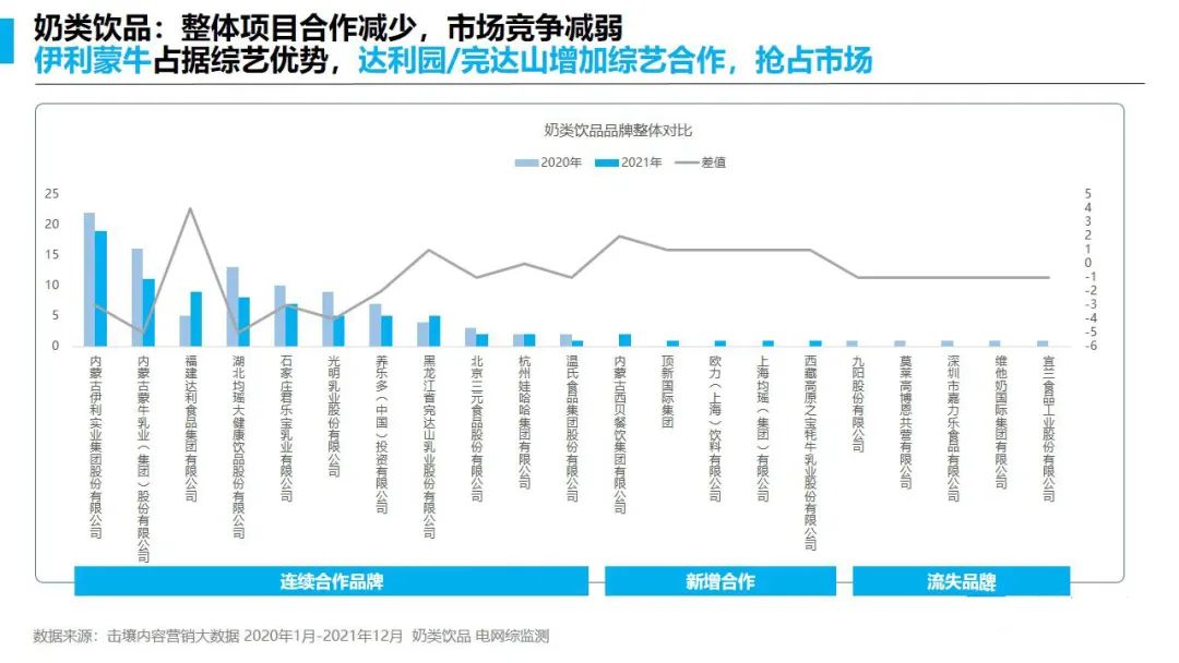 根据击壤内容营销大数据显示,蒙牛2020年综艺赞助数量15个左右,而2021年下降到10个左右,另一边的伊利从2020年的超过20个到2021年的20个左右,综艺投入相较稳定。