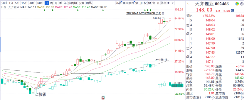 天齐锂业近期A股股价从65.35元涨至7月1日的133元,7月8日收盘达148元,涨幅不止翻倍。