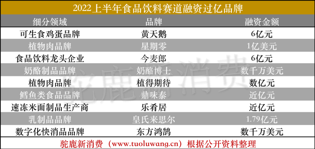 食品饮料作为消费行业中的刚需品类,即使在经济形势震荡下,依然是投资人最为看好的确定性品类。据驼鹿新消费不完全统计,2022年上半年,食品饮料赛道共发生46起融资事件,融资数量仅次于新零售;融资金额高达34.73亿元(另有7起融资金额未披露),占各赛道融资总额的六分之一,是新消费中最“吸金”的细分赛道。