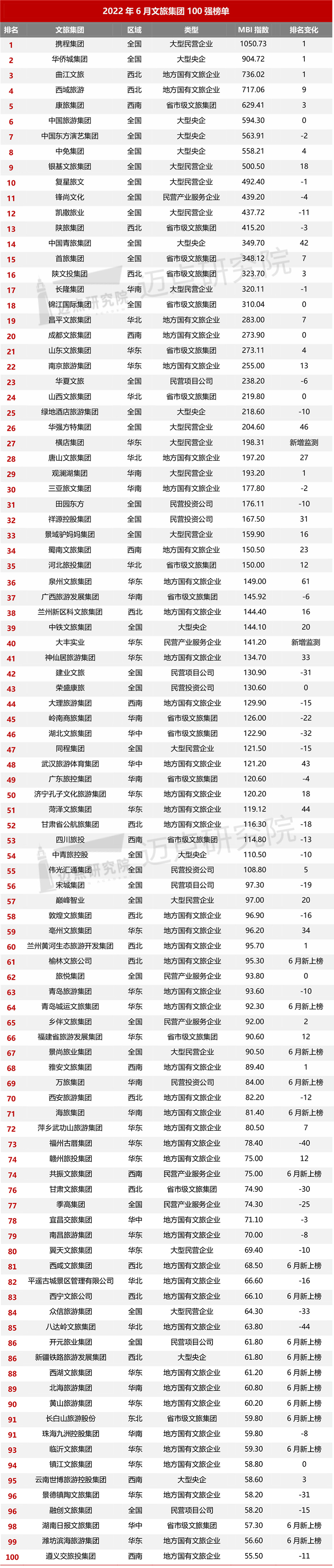 6月,携程集团、华侨城集团和曲江文旅位列前三甲,另有西域旅游、康旅集团、中国旅游集团、中国东方演艺集团、中免集团、银基文旅集团和复星旅文进入榜单前十。