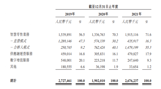 在友宝的业务分类中主要有四个版块,分别为智慧零售业务、供应链运营服务、数字增值服务和其他服务,各个业务分别以自动售货机的商品销售、机器销售租赁、广告、迷你KTV为重心。其中,智慧零售业务为其主要业务,报告期内所占总收入比例分别为56.5%、70.3%、71.6%,进而使得供应链运营业务等其余业务版块的总贡献力度下降。