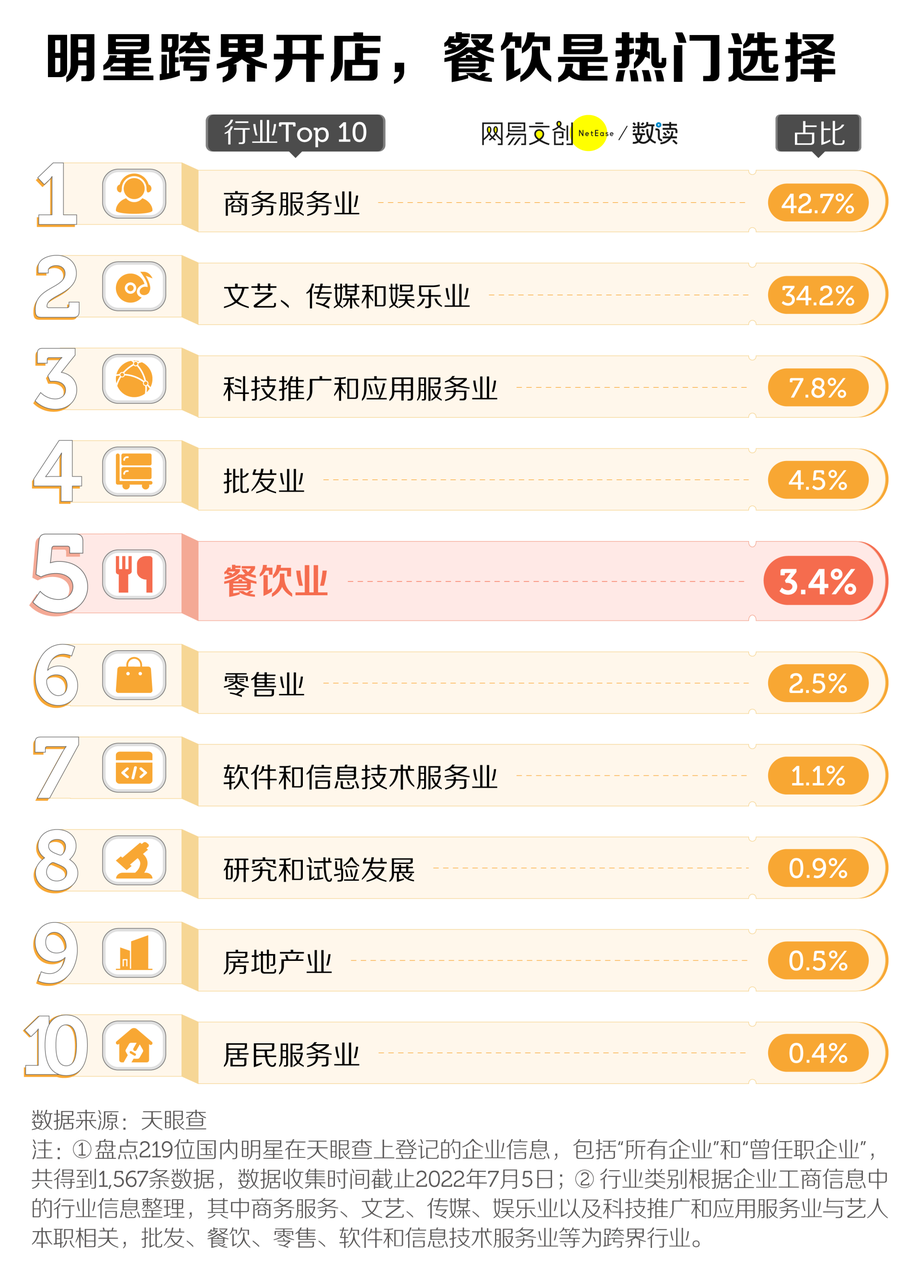 我们根据天眼查公开信息盘点了 219 位国内明星的企业信息,共得到 1567 家企业数据,也得到了类似的结论:除去多数与艺人本职相关的商务服务、文艺传媒、娱乐等行业之外,餐饮业是明星跨界开店的热门行业。