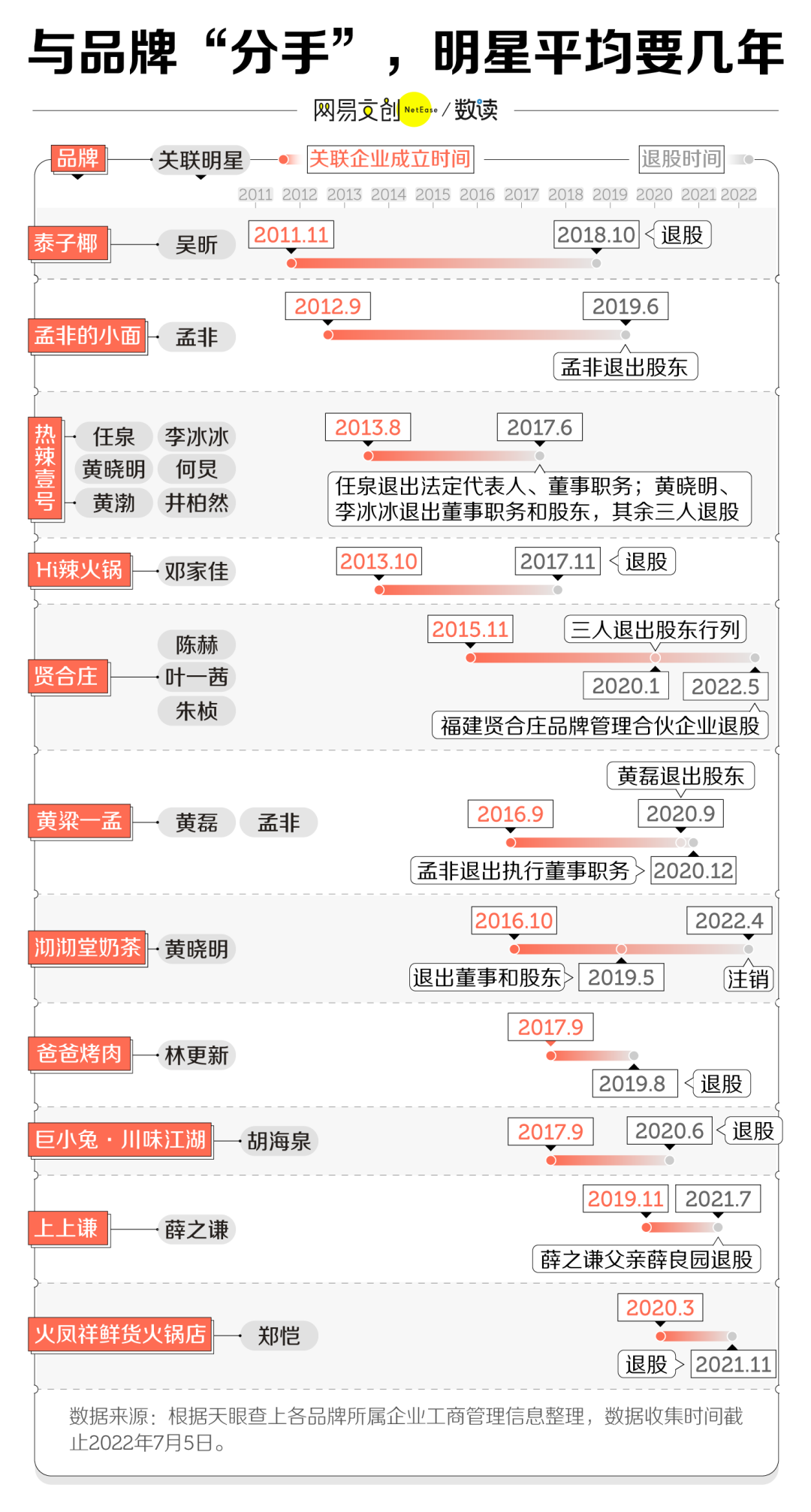 54 家明星餐饮企业,至少有 11 家的明星已宣告退局。其中,林更新与“爸爸烤肉”的实际关联只持续了不到一年;郑恺退股“火凤祥”,离店铺被曝食品安全问题不到三个月;“黄粱一孟”也真的像它的名字那样,成了黄粱一梦。