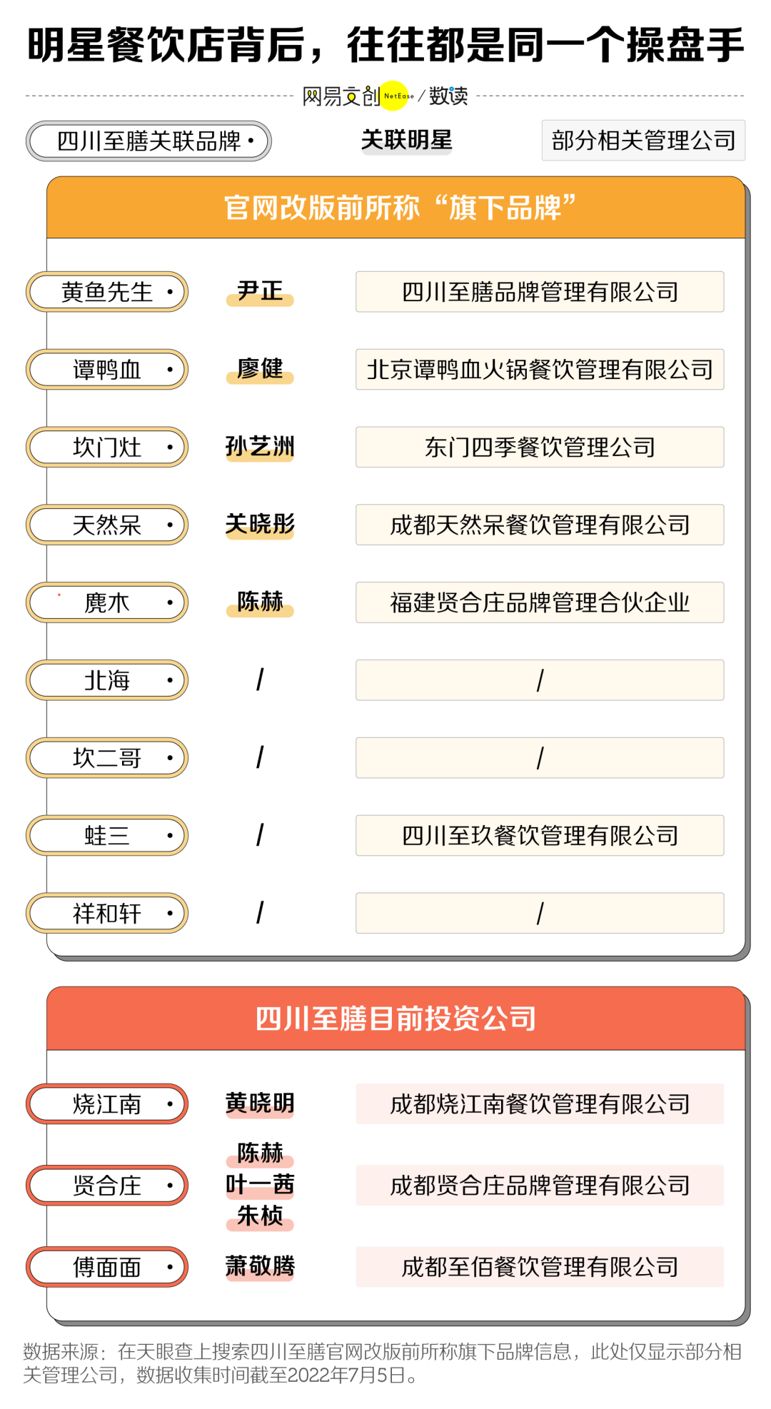 2016 年,韩寒“很不高兴遇见你”餐厅之一,因为无证经营、鼠患严重,被直接关门 [2];薛之谦关联火锅店上上谦分店、杜海涛和吴昕合开的“辣斗辣”分店、包贝尔的“辣庄火锅”也都爆出过食品卫生问题 [3]。