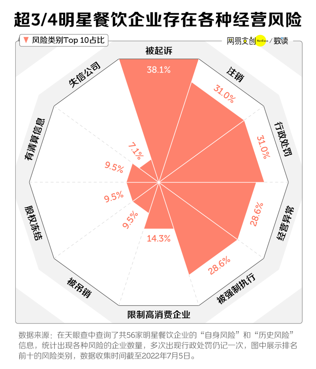 在我们统计的 54 家明星餐饮企业中,已有 17 家处于注销或吊销状态。超四分之三的企业出现过被行政处罚、列入失信名单、被起诉等各种经营风险。