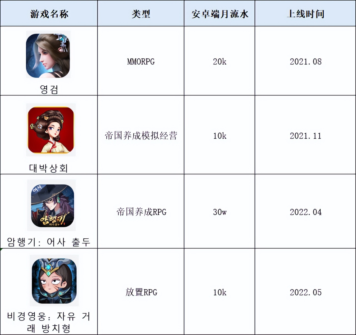陌陌旗下游戏发行品牌于今年 3 月在韩国市场上线了一款名为《Fairy Town》迪士尼画风的农场经营游戏,Sensor Tower 数据显示,发行之初这款游戏一度登上韩国模拟游戏免费榜 Top 20,随后排名一路跌到了 500 名开外;此前打造了爆款商业题材模拟经营手游《拜托了!社长》的益世界,去年也在韩国发行了古代韩式风格的模拟经营游戏《대박상회》,成绩也不太理想。2022 年,益世界在韩国的方向又回到了 RPG 游戏。