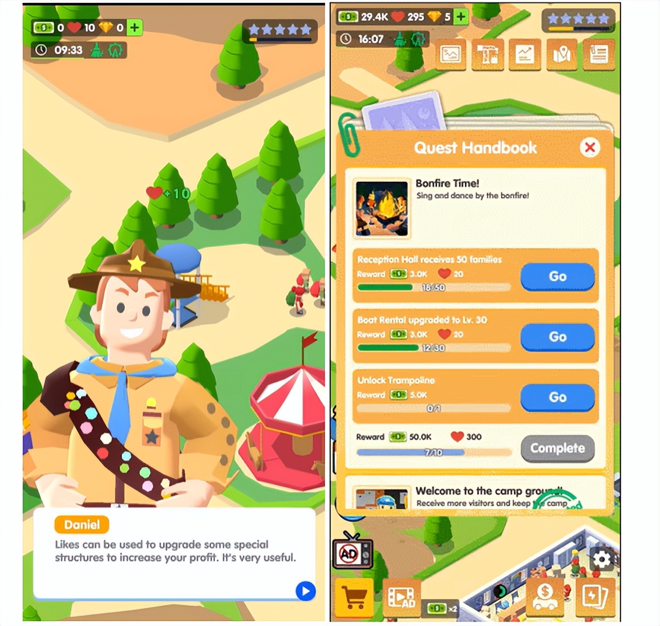 先来简单介绍一下《Camping Tycoon》的玩法。玩家被设定为一个小型露营地的经营者,游戏在一开始设计了一个名为“丹尼尔”的治安官协助玩家完成新手指引的步骤。在新手指引阶段,玩家会依次开拓房车营地、游乐场等基础设施,并且顺势学习游戏中的两个基础资源单位:现金和好评(likes)。二者主要用于升级各类建筑,而级别越高的建筑会为玩家带来更加丰厚的收益,从而带来一个正向的循环。