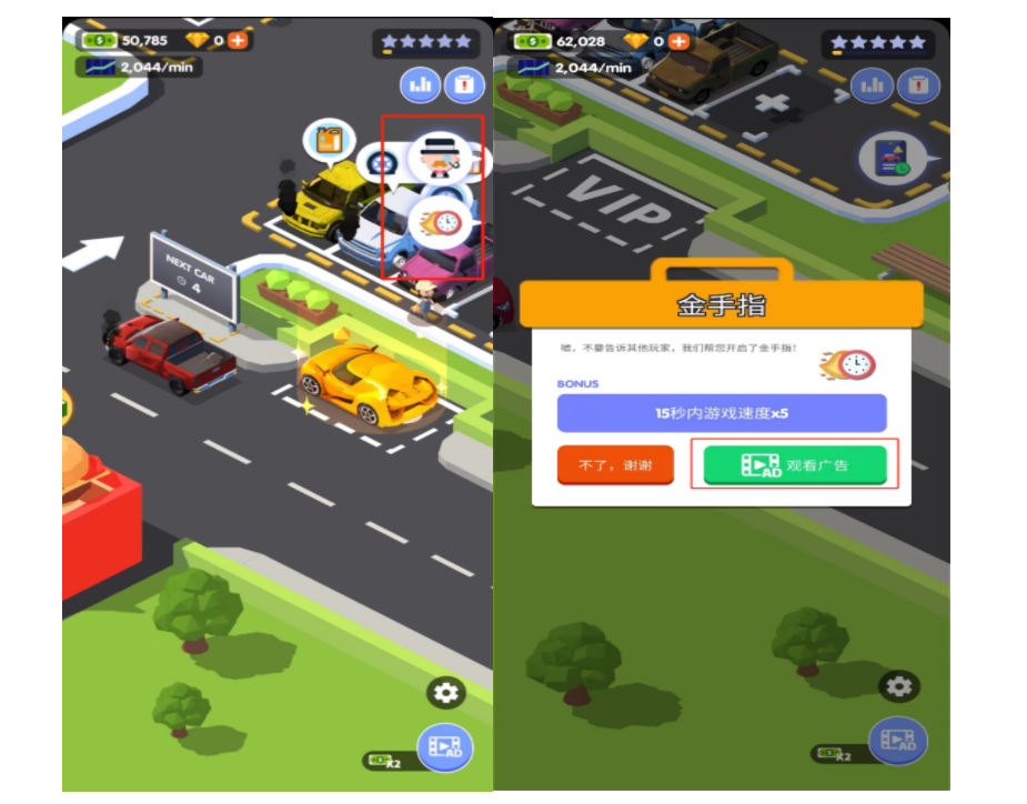 相较于更重一些的模拟经营,两款游戏均采取了内购+广告的混合变现模式,并且因为玩法更轻也更依赖于广告变现,包括包括弹窗广告、激励视频的,给到的都是游戏加速、收益翻倍这类的奖励;内购上则有些许的花里胡哨,以《Car Fix Tycoon》为例,这款以汽车修理为题材的游戏,游戏内的内购项目几乎都是围绕着提升修理厂的收益来设计的,有常见的有 VIP 权益包、付费抽卡、广告移除等。