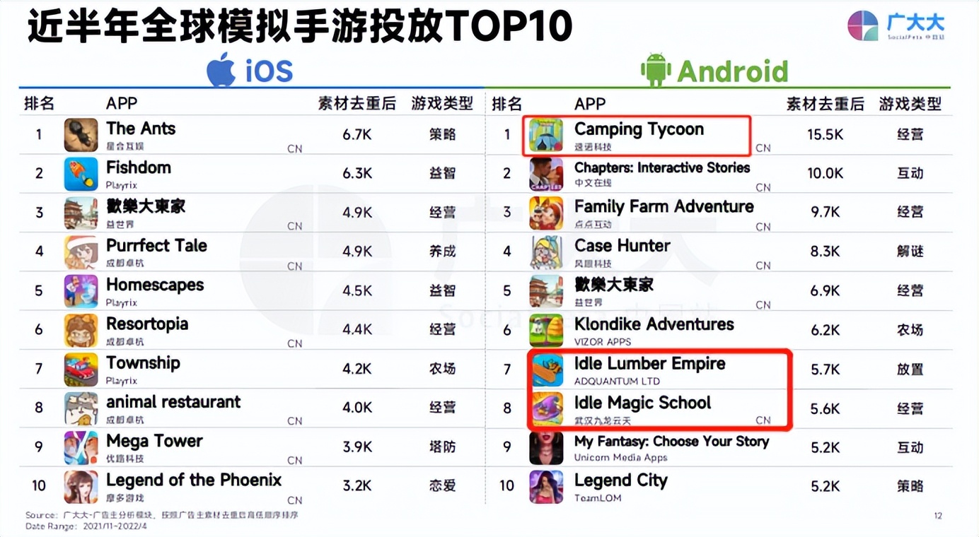 近一年来,在点点互动《菲菲大冒险》的优秀示范下(Sensor Tower 显示 6 月份全球双端流水 500 万美金),出海厂商纷纷在模拟经营赛道展开了尝试。在广大大近日发布的《2022 模拟经营手游全球营销洞察》中,笔者观察到近半年全球模拟手游投放 Top10 中,不乏大量的中小厂商,而这些产品的素材投放量颇为激进。