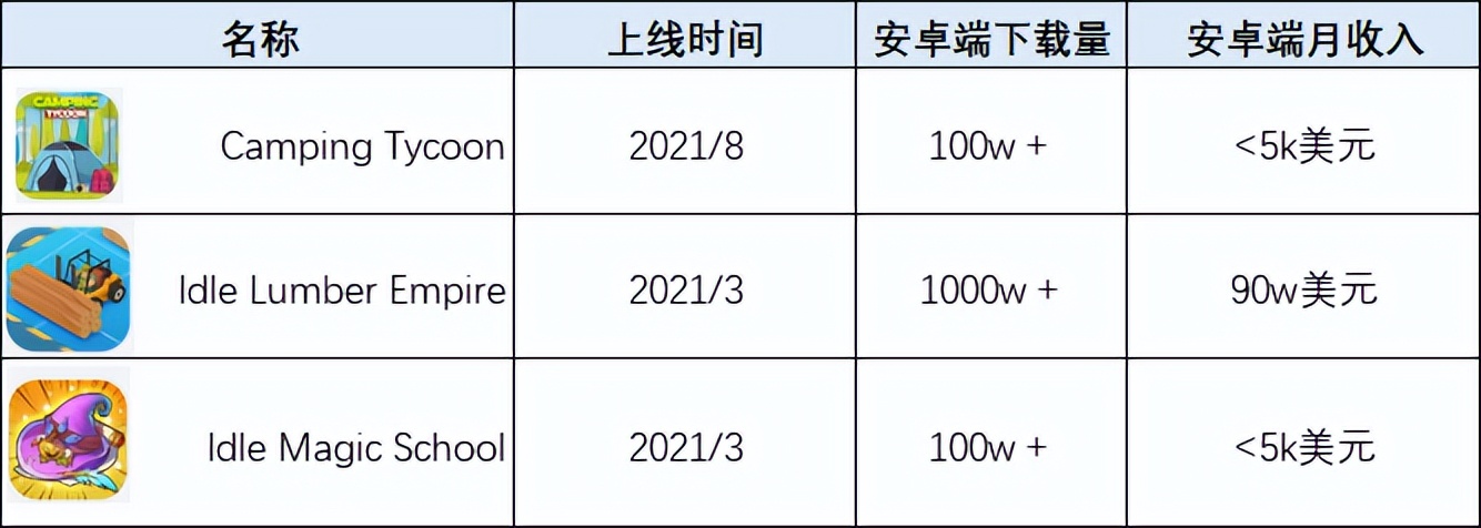 其中营收和下载表现最好的当属《Idle Lumber Empire》,根据 Sensor Tower 数据,这款游戏双端月流水能做到 190 万美金,近 3 个月安卓端模拟游戏榜的最高位次是 14 名,这样的表现几乎是让余下的两款出海游戏难以望其项背。