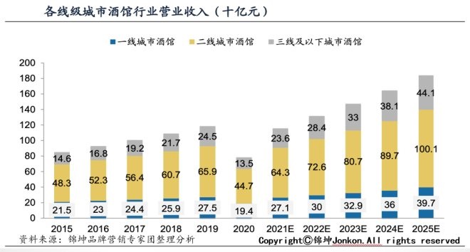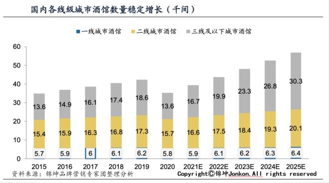 从酒馆数目上看,一二线城市增长放缓,三线及以下城市供给快速增加。2019 年年末,中国约有4.2万家酒馆,相比2015年末的3.5万家,在2015-2019年期间实现了5.0%的年复合增长率。其中一线、二线、三线及以下城市年复合增长率分别为 2.1%、3.0%、8.1%。预计2025 年酒馆数目有望达到5.7万间,一线、二线、三线及以下复合增速预计分别达到2.0%、 5.2%、17.4%。