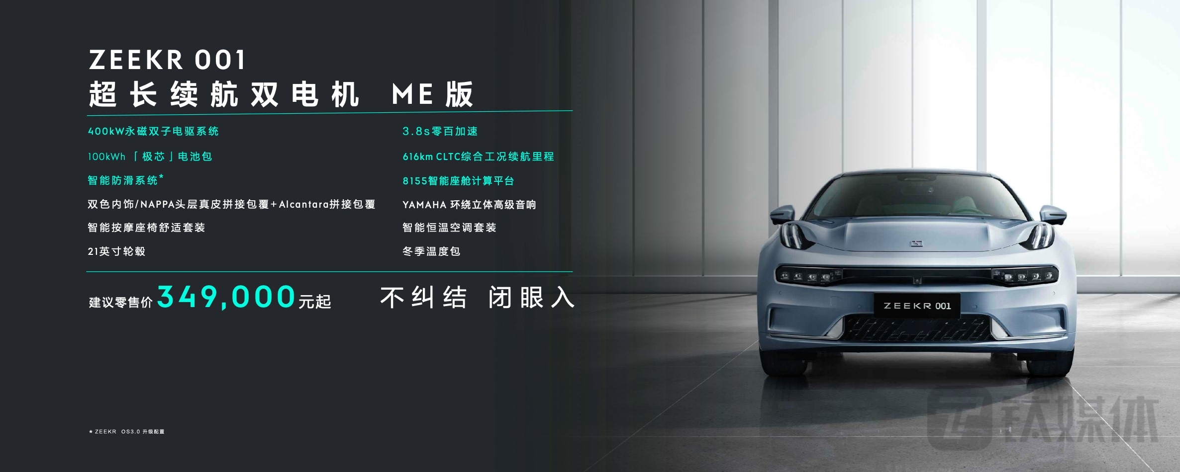 一向主打用户共创的极氪根据所有车主和意向用户的选购大数据分析和极氪伙伴线下调研,极氪基于用户呼声最高的“双百组合”—— 高性能双子永磁电机布局和100度极芯电池包,增加了一款源于用户需求的极氪001 ME版车型。