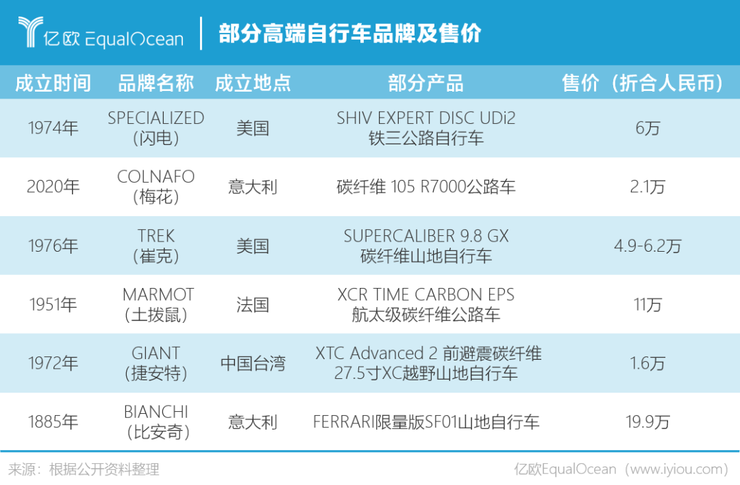美骑网运营总监何兆志告诉亿欧,国外的不少高端自行车品牌成立时间比较久远,早早形成了品牌溢价。比如,梅花成立于1954年,闪电创立于1974年,这些品牌通过时间的沉淀形成了品牌认知和文化输出。当一个高端且有知名度的消费品牌同时具有较长的时间积累,其溢价能力可能会越强。