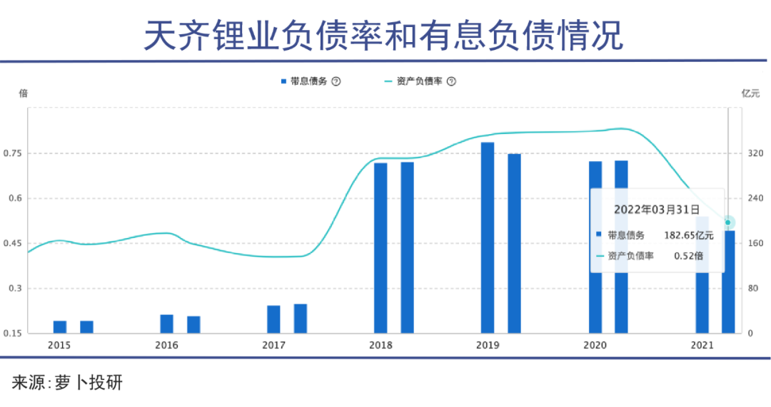 随着业绩的好转,天齐锂业债务情况出现“肉眼可见”的好转。2022年一季度,公司资产负债率大幅降至52%,有息债务下降至182.65亿元,一年内到期负债仅剩41.38亿元。