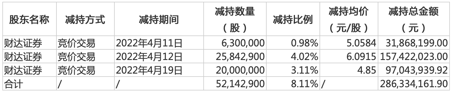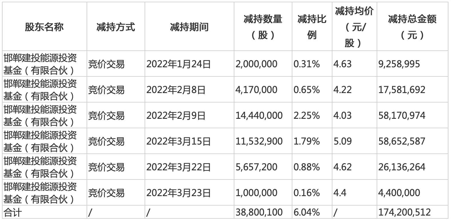 其中邯郸建投能源基金自2022年1月24日至2022年3月23日期间,通过集中竞价交易方式合计减持公司股份3880.01万股,减持完成后,邯郸建投的持股比例从年初的10.89%降至4.86%,套现总金额1.74亿元。