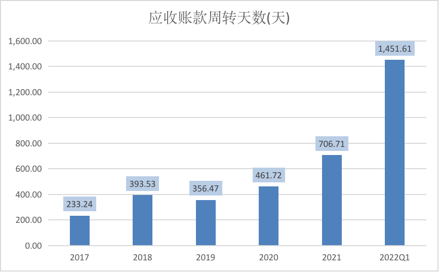 与此同时,公司还大量计提信用减值损失,导致亏损愈发严重。2021年,公司计提了1.14亿元的信用减值损失,主要为应收账款坏账损失。事实上,公司的应收账款长期居高不下,应收账款周转天数也越来越长。2021年其应收账款周转天数为706.71天,而今年一季度已增长至1451.61天,也就是说,公司的应收账款平均需4年时间才能收回。