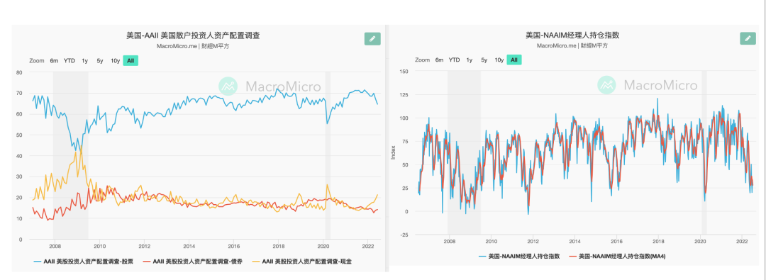 上图为美国散户资产配置情况和NAAIM经理人持仓指数,可以明显看到2022年之后无论是散户抑或是机构经理人其风险偏好都发生了明显的变化,如散户的现金持有量开始上升,股票占比明显下降(抛售迹象极为明显),经理人的指数已经接近2020年熔断水平。