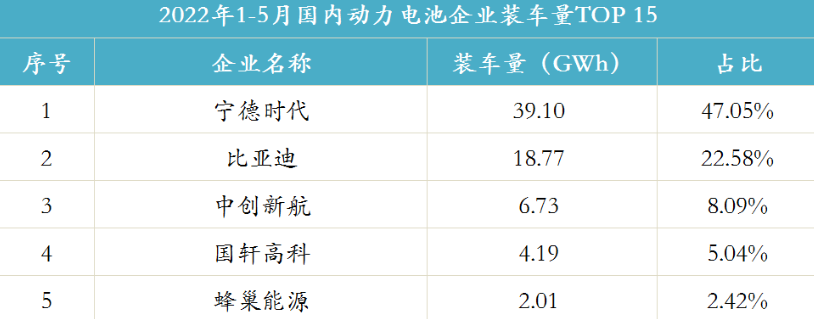 据中国汽车动力电池产业创新联盟发布数据显示,2022年1-5月我国动力电池累计装机量为83.1GWh,同比增长100.8%。排名前三的新能源车企分别为宁德时代、比亚迪、中创新航。其中,宁德时代以39.1GWh装机量占据全部市场的47.05%,较第二名比亚迪高出近25个百分点。