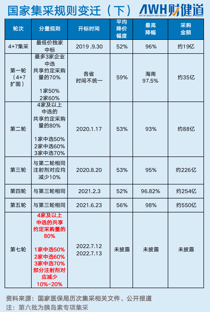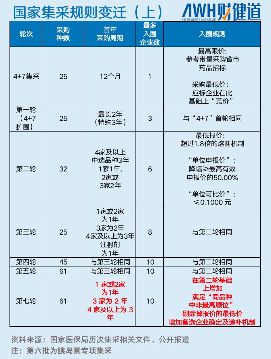 前六批国采共采购234种药品,平均降幅达53%,“砍掉”价格超2600亿元,这一批国采依旧,但总体上已进入“常态化”时期。引人关注的是,第七批国采引入“备供企业”和”备选地区”机制,改变了一个药品在一个省份只有一个中标企业的规则,屏蔽了断供风险。