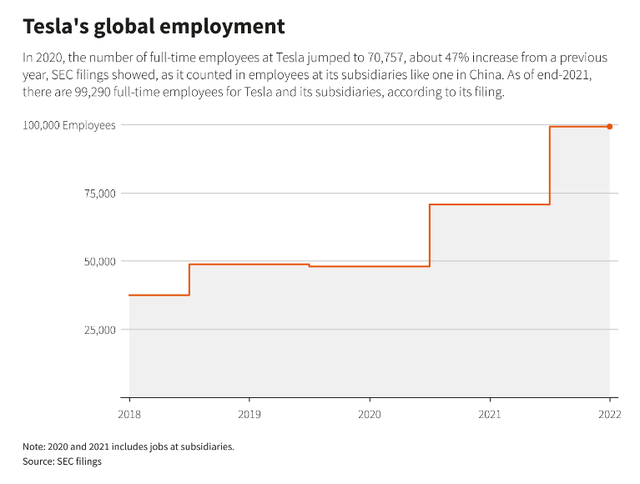 也就是说,特斯拉有一半的员工(5万人),是在过去两年内新增的。