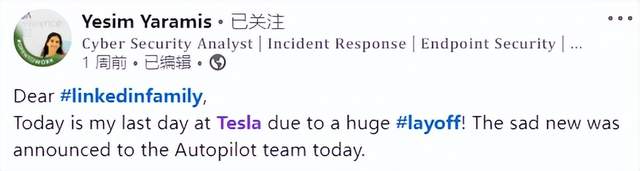 社交平台上的信息显示,Adella是在6月底被裁员的,她已经在特斯拉工作了三年,是一个小团队的leader。