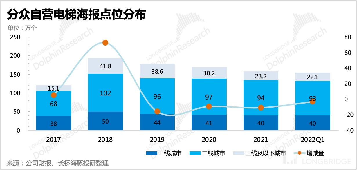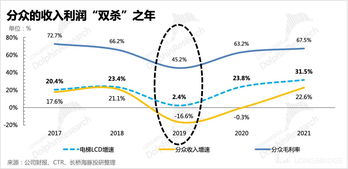 双管齐下确实奏效,分众 2019 年的收入大幅下滑 17%,而同年整体线下广告收入仅下滑 1.3%,电梯广告(包含电梯 LCD 和电梯海报)则还能有同比 2-3% 左右的正增长。