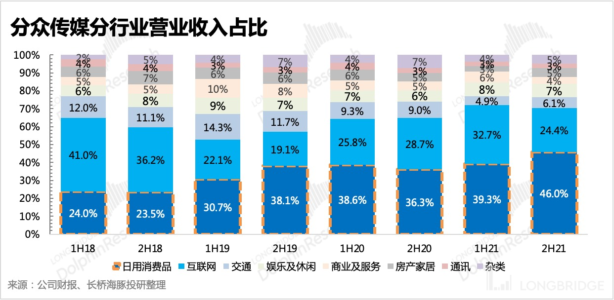 虽然整体经济在放缓的大周期,但分众还是凭借其独特的流量卡位,搭上了移动互联网、国货潮流、新消费这三波行业赛道的春风。从分众的收入结构也可以看出,早期互联网行业广告占比最高,而目前快消品的广告则成为大头。