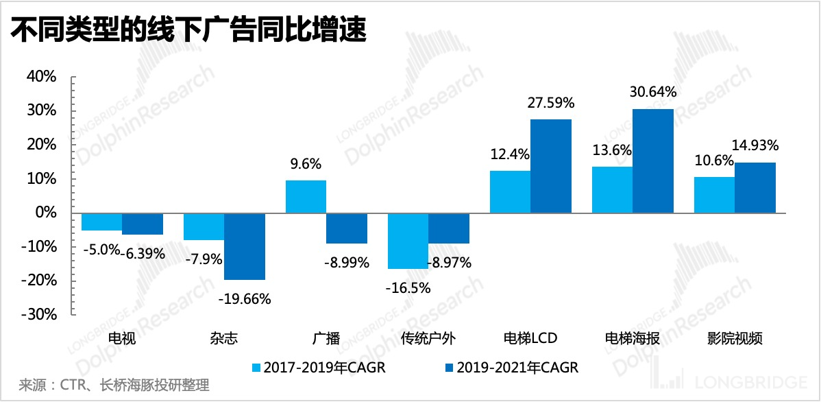 因此在过去几年,分众等梯媒虽然会受到线上广告的影响,但他们可以通过侵蚀其他传统线下广告的规模来维持一个不错的增速。