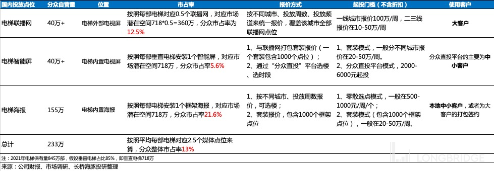 我们以收入占比在 80% 左右的梯媒收入(剔除疫情对影院广告的影响)为例,按照不同的载体媒介,分众提供给客户投放广告的合作方式主要有三种。