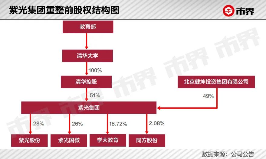 2010年,紫光集团正式确立混合所有制模式,引入民营企业股东。从那时起,直到本次重组完成之前,紫光集团的股权结构都是由清华控股持51%股权,北京健坤持有49%股权。其中,北京健坤由紫光集团前董事长赵伟国实际控制。