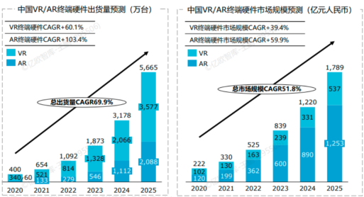 亿欧智库发布的《2021中国VR/AR产业研究报告》显示,2020-2025年,中国AR终端硬件出货量将保持103.4%的年均复合增速,远高于VR设备。预计到2025年,中国AR终端硬件出货量将达2088万台。与此同时,国内AR终端硬件的市场规模也将水涨船高,达到1253亿元。