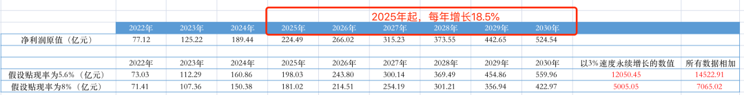 高速增长率前3年;中速增长率18.5%的g2;低速增长率3%的g3;贴现率5.6%的WACC;FCF0取2021年净利润30.45亿元。
