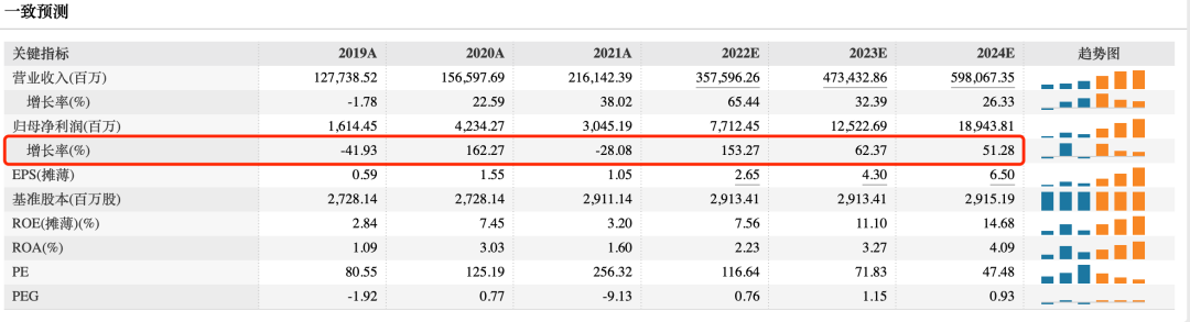根据Wind一致预期,机构普遍预计,比亚迪2022-2024年分别为77.12、125.22、189.43亿元。我们可以用这三个数据,作为高速增长期的前三年的数据。