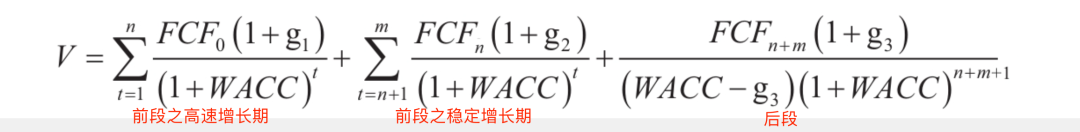 以上公式中,V为企业价值,FCFt为t年的经营资产自由现金流,WACC为贴现率,n为成长阶段的期限,m为过渡阶段的期限。g为企业增长率(growth简写)。g1为高速阶段的增长率,g2为稳健阶段的增长率,g3为后段平稳增长率。
