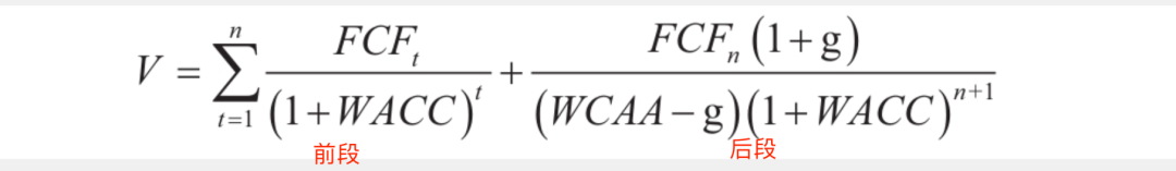 “后段”则直接采用“价值=自由现金流/(折现率-永续增长率)”计算。然后将“前段”和“后段”分别折现加总,得出企业内在价值。