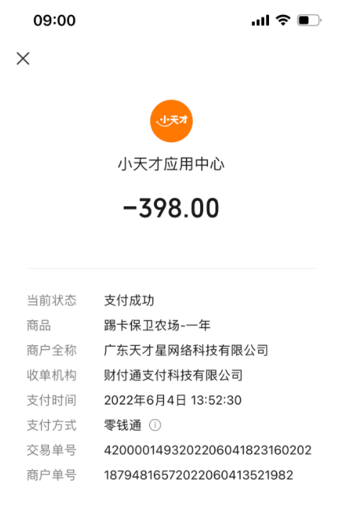 一位家长表示,小天才电话手表内置游戏吉米猫,在该儿童手表绑定的家长手机短信和微信没有任何联系记录和授权的前提下,从2022年6月12日起分次通过家长的同号微信支付收取费用共467元。家长查看微信支付才发现,该游戏运营商无法联系。